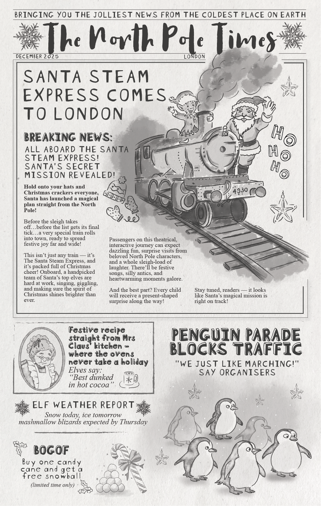 Recently, I had the pleasure of working alongside a theatre company – wiseowltheatre.com on a project that combined steam engines and theatre — creating old-style illustrated children’s newspapers designed to be given out to families across several train stations.
